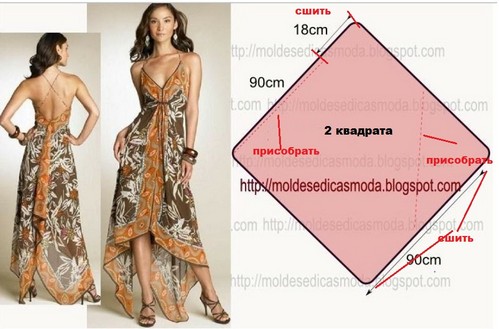 Тем, кто не в состоянии справиться с шитьем модели по стандартной выкройке можно рассмотреть элементарные варианты. Например, допустимо просто соединить швами 2 куска полотна, которые выполнят роль спинки и переда. Дополнительно можно оставить разрезы по бокам, пришить бретели или воланы, декорировать изделие.