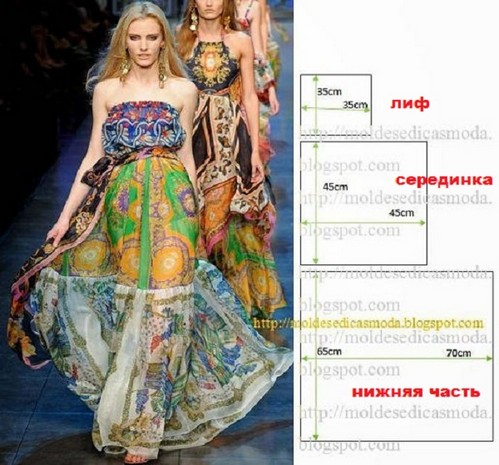 - Для следующего изделия понадобятся детали: 2 шт. со стороной 35 см (лиф), 2 шт. со стороной 45 см (верхняя часть юбки), 2 шт. шириной 65-70 см с произвольной длиной (нижняя часть юбки). Чтобы пришить их друг к другу, необходимо бОльшую деталь присборить до длины меньшей. Верх лифа подгибается – это кулиска, в которую потом нужно вставить резинку. Талия подчеркивается либо резинкой, либо пояском в тон.