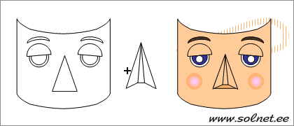 - Для начала можно взяться за лицо игрушки. То есть, следует одну треть части оставить для обозначения глаз и носа. Таким образом, нужно взять краски (лучше, если они будут акриловыми) и закрасить выделенную сторону. Далее из небольшого отрезка бумаги сделать нос, предварительно сложив деталь в треугольную форму и зафиксировав её на поверхности. Что касается глаз, так это полёт вашей фантазии. Здесь вы можете с помощью ручки нарисовать любую разновидность, по вашему усмотрению.