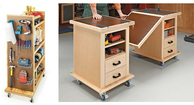 Вертикальный стеллаж в виде мобильного стенда – отличный выбор для размещения подручного инструмента. Его рекомендуется делать из дерева или фанеры. Отдельные группы инструментов располагают на крючках, магнитах или полках. Часто используют для вертикальной системы хранения специальные перфопанели.