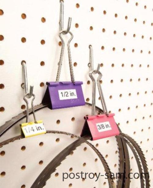 . На разъемные концы нанизывают шайбы с гайками, а размеры фурнитуры указывают на картонных ярлычках. Ножницы с ключами развешивают на металлических крючках. - Для сверл, фрез и хранения ключей в гараже к стене прикрепляют накладку из пенопласта