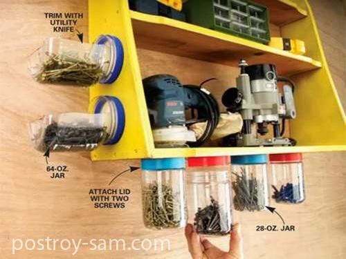 . Такие мелочи, как гвозди и саморезы, можно положить в банки из пластика, в которых был майонез или хрен. Их крышки прикручивают к полкам. - Можно сделать под гайки, шайбы, ножницы и для ключей стенд