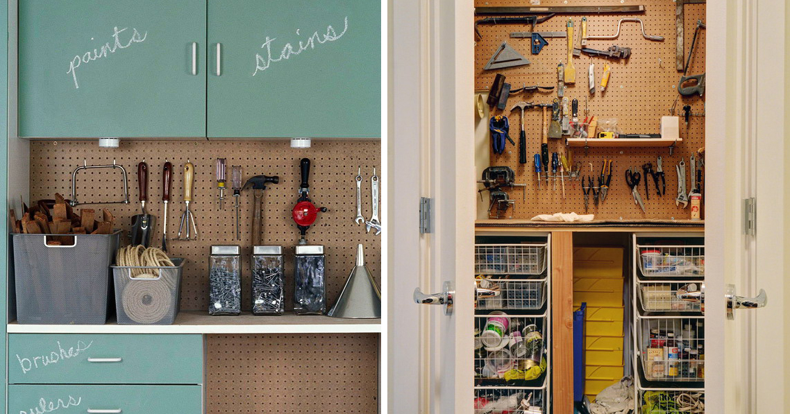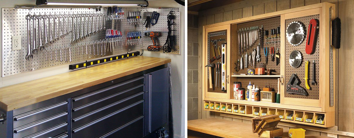 Несколько перфорированных панелей из металла или фанеры под столом или в шкафчике позволят обзавестись эргономичным и удобным местом для вертикального хранения небольшого ручного инструмента.