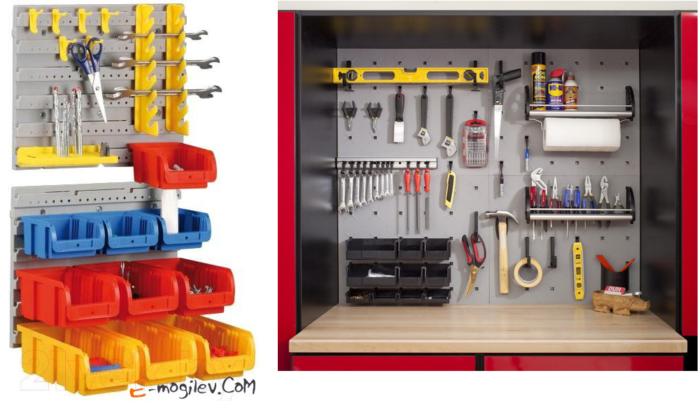 . На них закрепляют отвертки, гаечные ключи, плоскогубцы. Чтобы сделать щит для инструмента в гараже своими руками, используют массив доски и прочные крючки. Комплектация зависит от собственных предпочтений мастера.