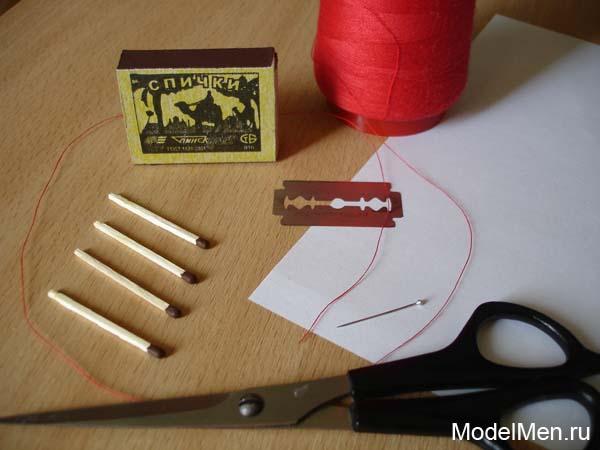 Теперь к одной из спичек при помощи ниток примотайте иголку.