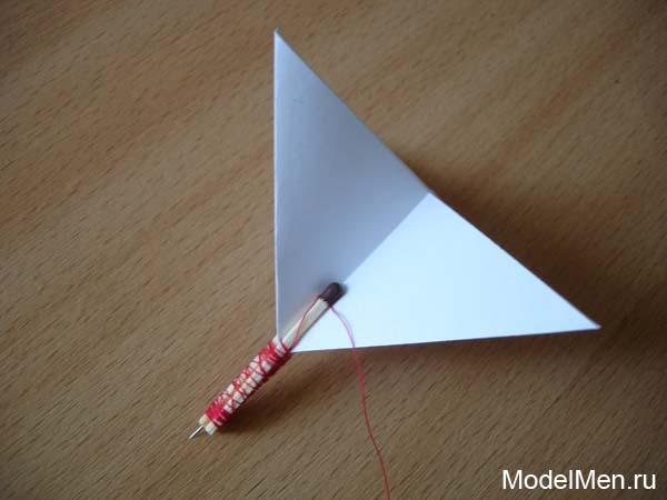 Не обрезая нитки вставьте в между спичек наш ранее заготовленный квадрат из бумаги, теперь он будет служить стабилизатором для дротика.