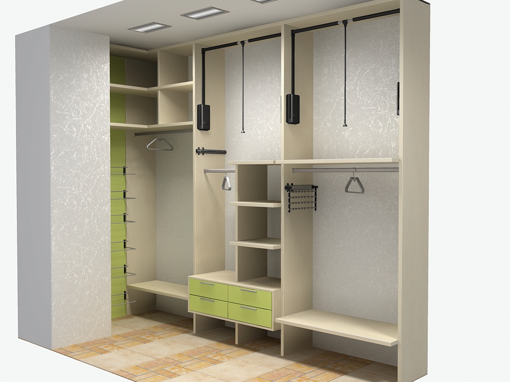 - Самый простой случай — сделать некоторое количество полок и отделов для одежды на вешалках.