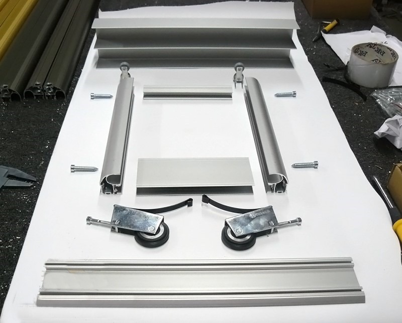 - Опорная конструкция. Она содержит 2 направляющие из алюминия, ролики, раму жёсткости из профилей.
