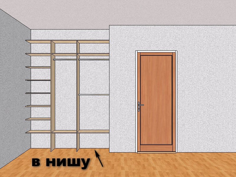 - Стенки. Их количество зависит от типа шкафа. При помещении в нишу «на всю стену» в конструкции стенки вообще не нужны, если высота не более 2,8 м. При большой высоте устанавливают крышку (верхнюю панель). В варианте «до двери» или «до окна» придётся смонтировать одну боковую стенку. Отсутствие боковых и задних стенок — главное преимущество встроенной конструкции, так как экономит полезный объём.