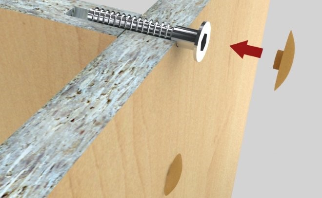 - На мебельных шкантах. Для них на торце полки и на перегородке сверлят отверстия по диаметру шканта. Отверстия в стыкуемых деталях должны строго совпадать. Шкант аккуратно забивают в отверстия полки, фиксируют клеем ПВА, а затем другой его конец вводят в соответствующее гнездо перегородки. Данный способ популярен при заказе распила специализированной компании. Она предоставляет детали с готовыми отверстиями и шкантами, что значительно упрощает сборку.