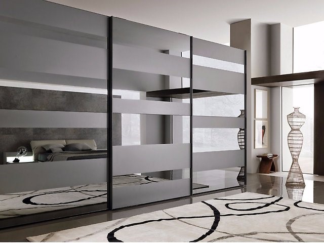 Такой примем — большие зеркала помогает сделать помещение светлее. Кроме того, за счет отражения, теряются границы пространства и даже небольшое помещение кажется более просторным. Такое оформление фасада шкафа купе идеально подходит для строгих , модерн. Но гладкое большое зеркало не всем нравится — слишком лаконично и не для всех интерьеров подходит. В таком случае можно сделать наборные зеркальные фасады. Куски зеркала перемежаются профилем, в результате получаются квадраты или прямоугольники. Перемычки могут быть разной толщины, цвета. В общем, довольно интересные могут быть варианты дизайна дверей для шкафа купе.