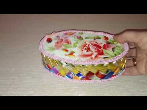 Плетется столь же просто, как и браслет. Сделайте несколько рядов из сложенных полосок – фантиков, а затем скрепите их между собой так, чтобы получилась корзинка.