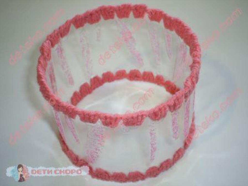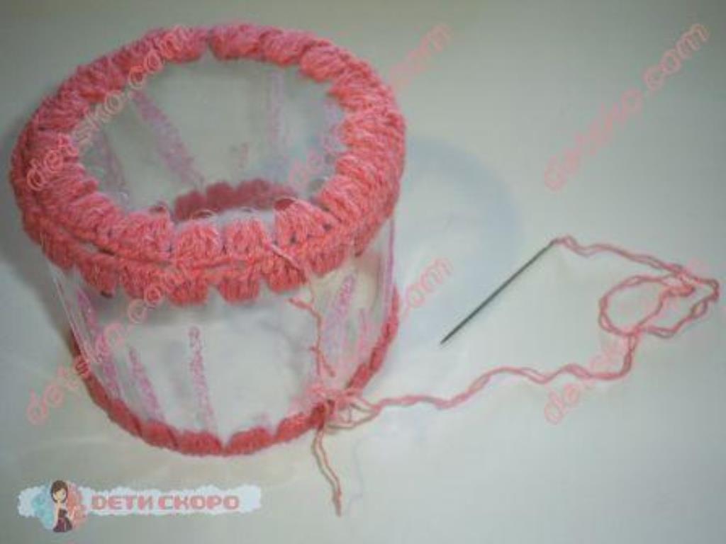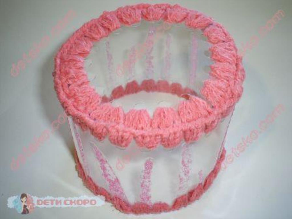 Любая шкатулка из пластиковых бутылок своими руками делается по схожей технологии. Конструкция составляется из отдельных элементов, например прямоугольников, соединенных между собой с помощью обвязывания крючком простыми столбиками без накида. Соответственно, в пластиковой основе предварительно выполнены отверстия вдоль краев.