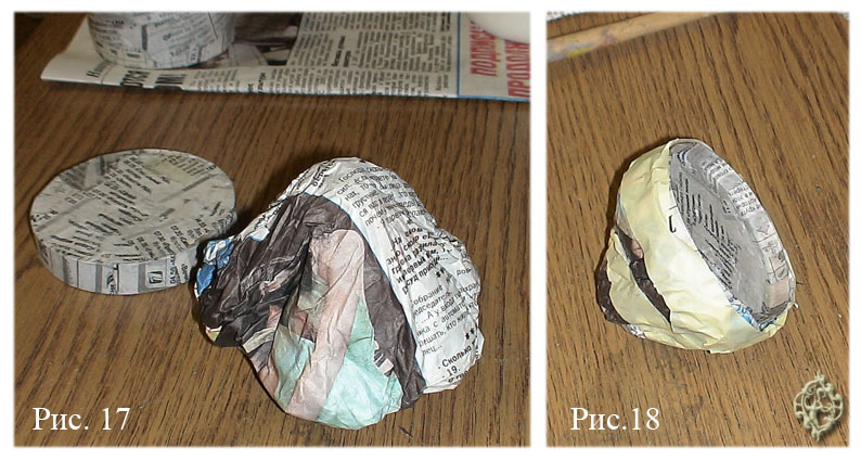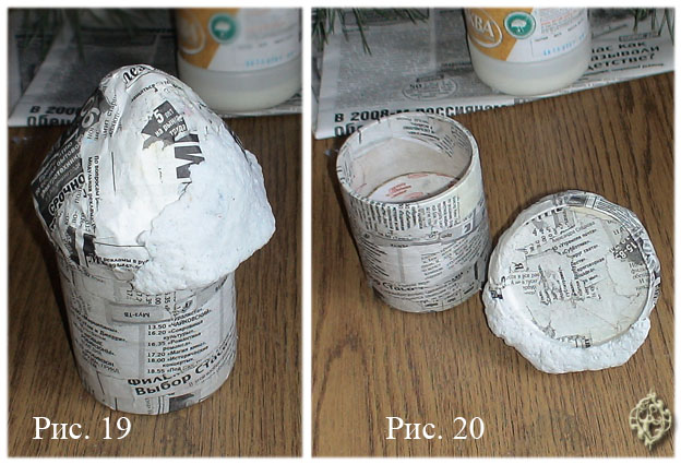Когда бумажная масса готова, начинаем работать над крышкой шкатулки. Если вы оклеили крышку не в 5, а в 10-15 слоев, то вам эта бумажная масса вовсе ни к чему. Только разве что шарики сделать, как на шкатулке-мухоморе… Но и здесь можно обойтись, вклеив в крышку портновские булавки с круглыми головками-бусинами. Если крышка у вас получилась твердой, как дерево, то бумажной массой можно не пользоваться. Если же нет – то лепим эту самую массу на крышке, придавая ей форму шляпки гриба или крыши домика (рис. 19-20). Можно тут же вылепить дымоходную трубу. Когда импровизированная крыша готова – откладываем ее в сторону для сушки.