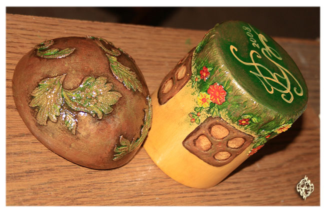 Я очень люблю золотую акриловую краску, поэтому и здесь без нее не обошлось! Кусочком поролона прошлась по оконным рамам и по крышке. Облагородила, называется!