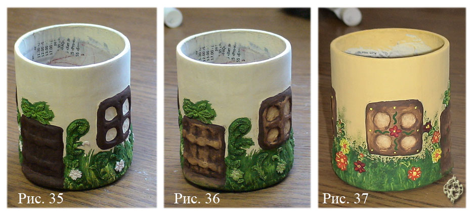 Лепим окошки – сначала квадратики из массы, потом концом фломастера или ручки вдавливаем бумагу, имитируем оконную раму (рис. 24-25). Можно внизу шкатулки вылепить подобие травы, или сделать «каменную кладку» из кусочков бумажной массы – на ваше усмотрение. На рис. 26 – результат нашей работы.