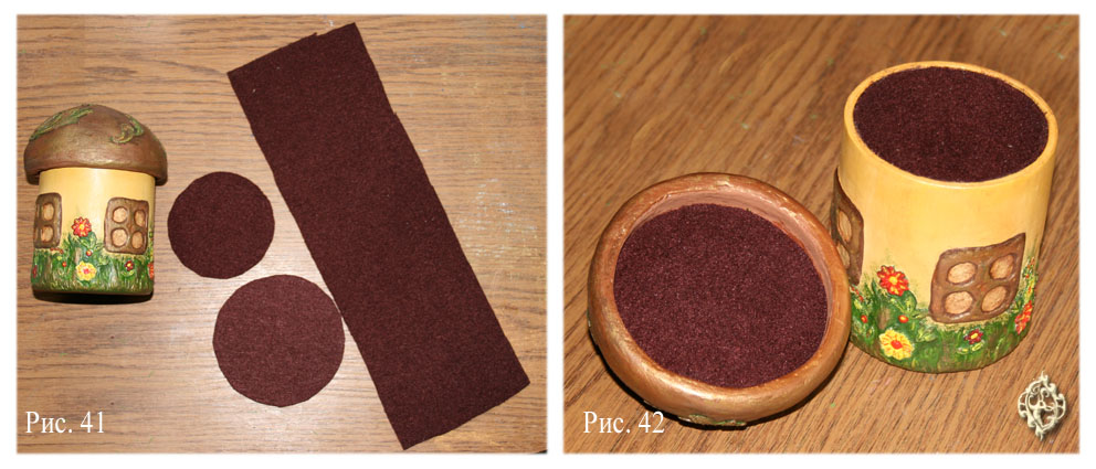 Шкатулка у нас должна выглядеть богато и красиво не только снаружи, но и внутри. Поэтому не жалеем кусочки бархата или велюра, или любой другой плотной, но красивой ткани. Вырезаем 2 кружочка – для крышки и для донышка, и полоску ткани – для внутренней стенки шкатулки. Ткань приклеиваем клеем «Полимером», осторожно, чтобы клей не прошел сквозь ткань. Аккуратно склеиваем стык на внутренней стенке (рис. 41-42).