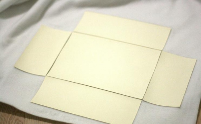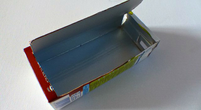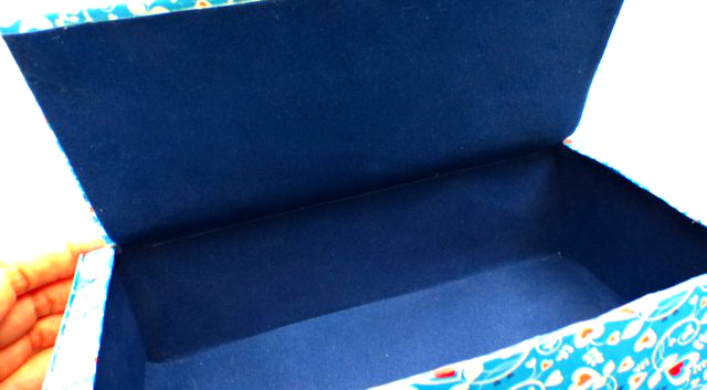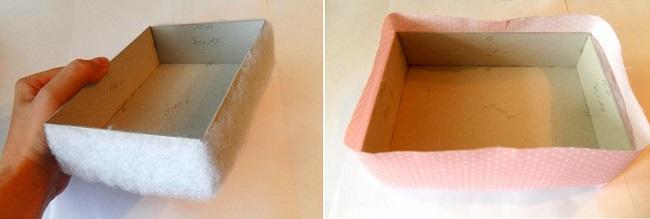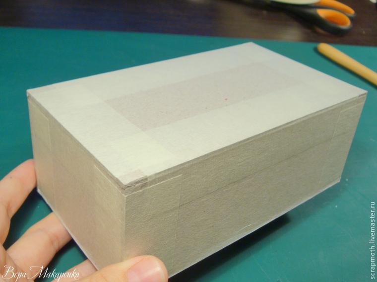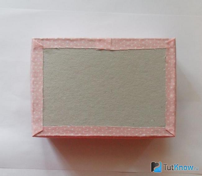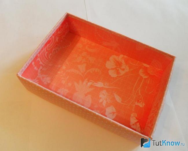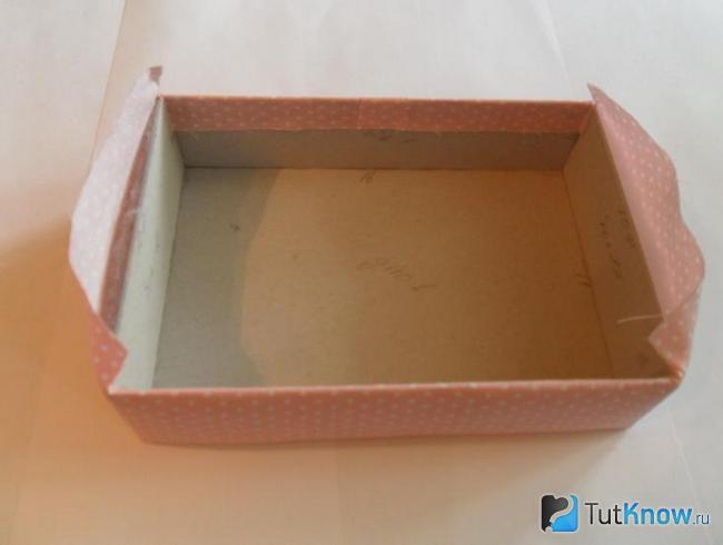 - Также обклеивают сначала боковую наружную сторону, затем дно. Внутреннюю часть закрывают белой плотной бумагой.