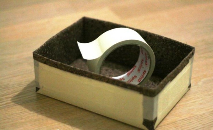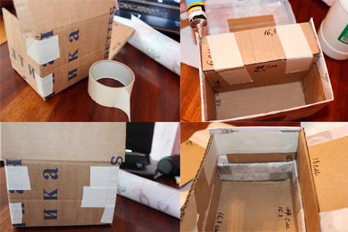 Основу сделала из гофрокартона. В этот раз стенки попробовала склеить малярным скотчем. Способ так себе!))