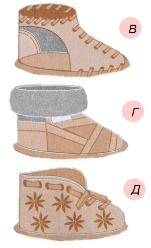 Вы можете комбинировать различные цвета и материалы от льна до искусственного меха. Старайтесь использовать для подошвы материал, который не будет скользить.