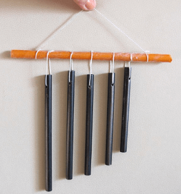 На горизонтальную палочку подвешиваем звенящие предметы (ключи, металлические пробки, палочки). Извлекаемый звук похож на колокольчики такой же как использует настоящий оркестр. Можно разобрать уже готовую фен-шуй подвеску, и использовать некоторые предметы из нее.