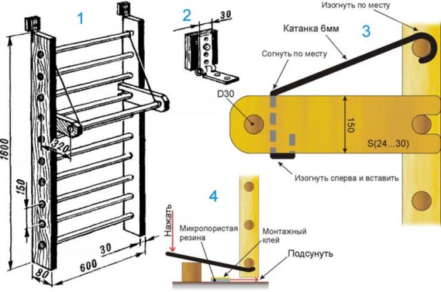 Прежде чем изготовлять оборудование, надо знать нужный порядок работ и подготовить пиломатериалы. Прежде чем покупать стойки, нужно обдумать вариант их укрепления, а если есть возможность, приобрести дополнительные стойки. Чтобы перекладины надёжнее укреплялись, нужно закруглять уголки и изготовить выемки. Укреплять перекладины к стойкам надо под углом в 81 градус. Данное положение сможет обеспечивать надёжность изделия, само изделие сможет выдержать достаточную массу.