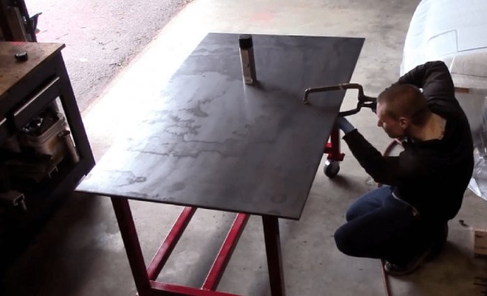 Плиту столешницы вырезают по чертежу и укладывают на готовый каркас. Прежде чем сварить, необходимо проверить наличие зазоров и подогнать опорные места так, чтобы столешница опиралась на все четыре точки основания. Металлическую плиту фиксируют струбциной и приваривают к каркасу углекислотным полуавтоматом.