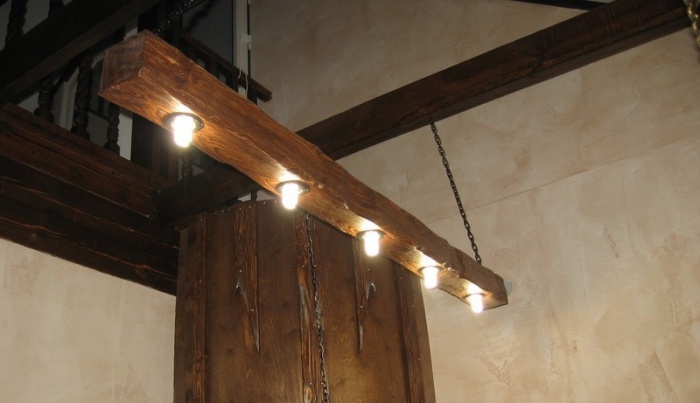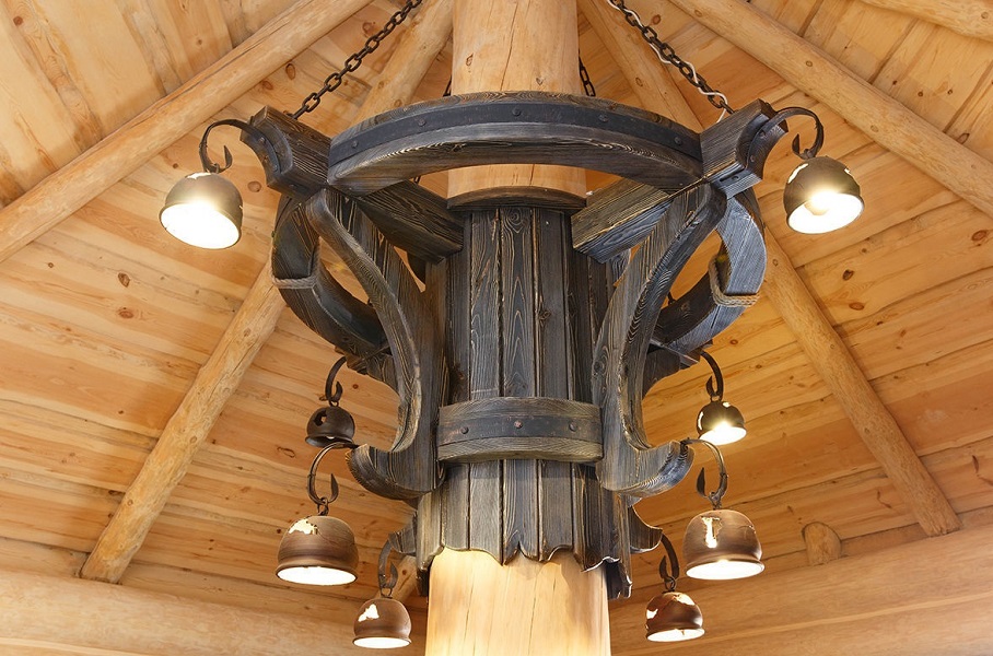 Лампы в форме свеч наиболее точно соответствуют тематике старины. Потолочная люстра из дерева с многочисленными подвесными элементами способна развеять тьму даже в большом помещении. При наличии опыта работы с металлом, подобную деревянную модель можно собрать собственноручно.