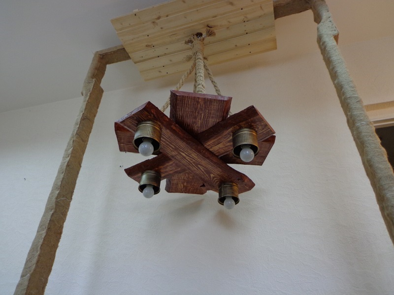 Завершает раздел люстры из дерева под старину фото своеобразного комбинированного экземпляра из двух представленных ранее моделей.