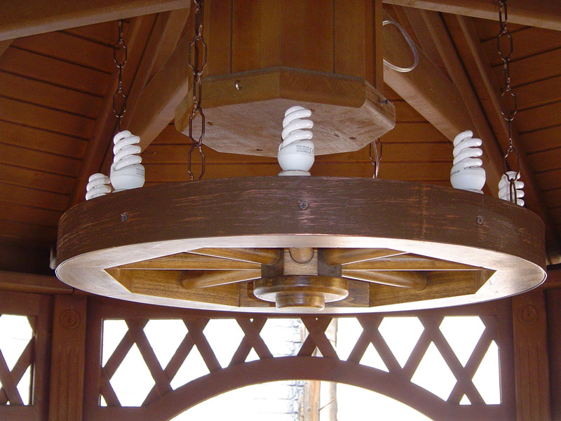 Очередной деревянный экземпляр, предназначенный для использования на улице. Непривычная форма люстры из дерева фиксируется на столбе и дает полноценное освещение прилегающей территории.