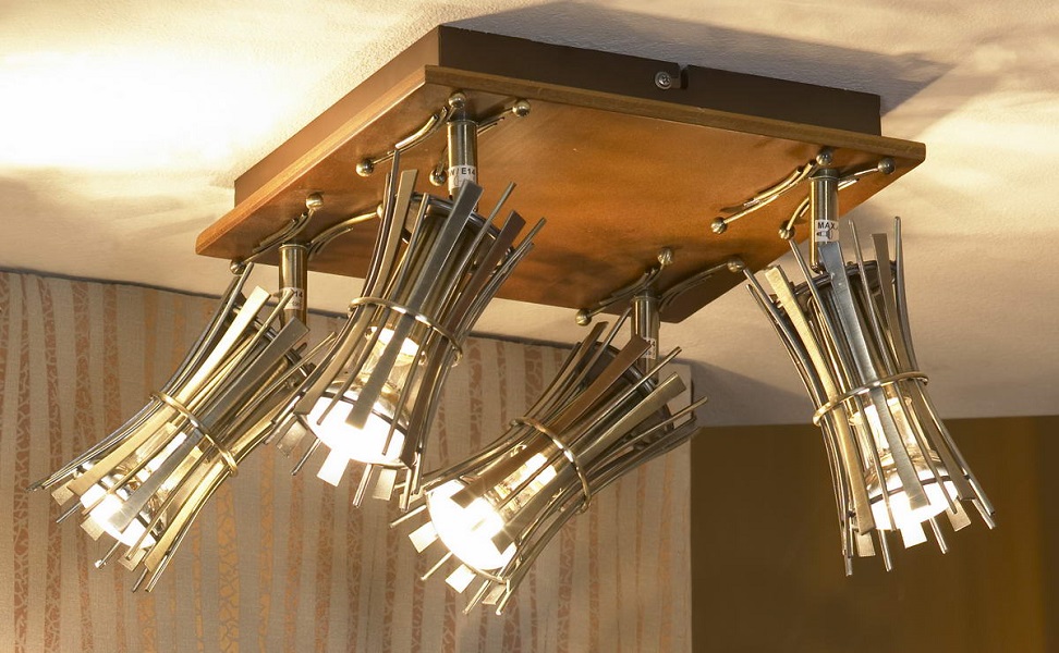 Светильник из металла и дерева отличается высокой функциональностью благодаря возможности регулировать направление световых потоков. Идея сложна в исполнении собственноручно, поэтому лучше остановиться на покупке готового экземпляра.