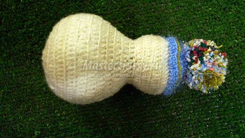 Как только это произойдет, начинаем убавлять петли, в каждом ряду делая по три столбика с накидом с одной вершиной. Вяжем так максимально количество рядов, при котором пластмассовое яйцо еще может помещаться в отверстие вязания. После этого помещаем яйцо в вязание.