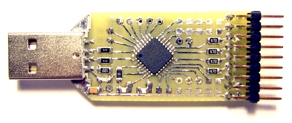 На рисунке 3 представлено готовое устройство. Хотя изначально плата была сделана для первого варианта, позже микросхема MAX232 была демонтирована за ненадобностью. Сейчас переходник успешно применяется для связи микроконтроллеров AVR c компьютером по UART.