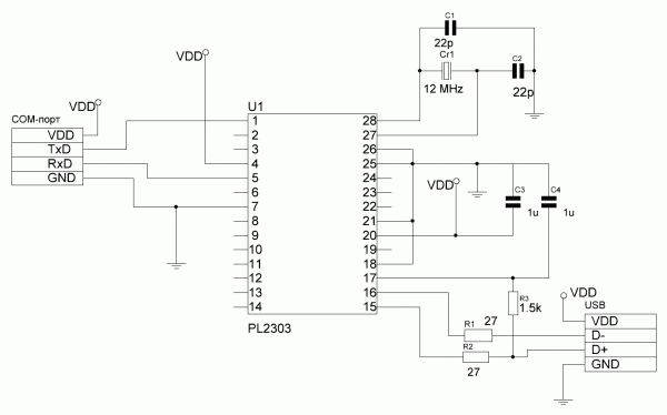 Рисунок 2 — Схема переходника USB-COM-порт на микросхеме PL2303 без сопряжения уровней
