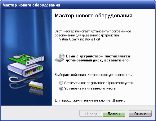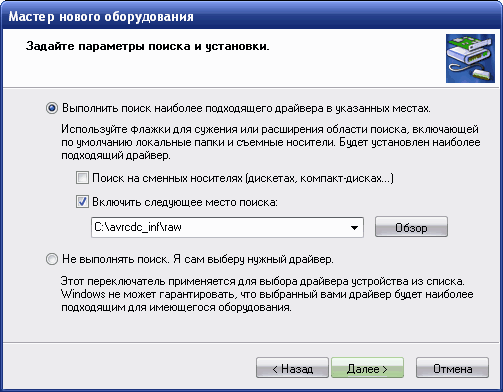 Теперь вставляем в USB порт компьютера наш адаптер, компьютер должен выдать сообщение «Найдено новое устройство», а затем предложит установить для него драйвер. Выбираем пункт «Установить с указанного места» и нажимаем на кнопку «Далее». Затем в новом окне выбираем путь к папке скаченного и распакованного драйвера и опять жмем кнопку «Далее». Спустя несколько секунд драйвер будет установлен и устройство будет готово к работе.
