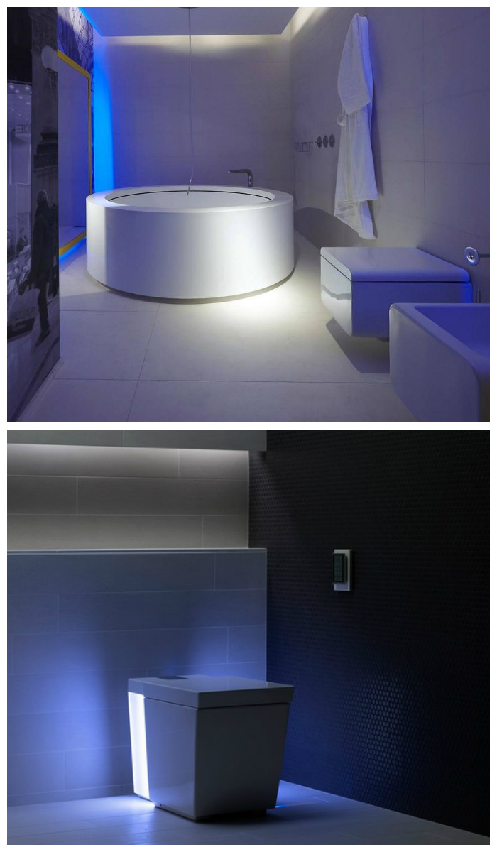 Если по периметру потолка расположить точечные светильники и осветить каждую полочку, то помещение зрительно расширится. Сантехнику, стиральную машину и мебель можно приобрести компактных размеров и разместить так, чтобы было занято как можно меньше места.