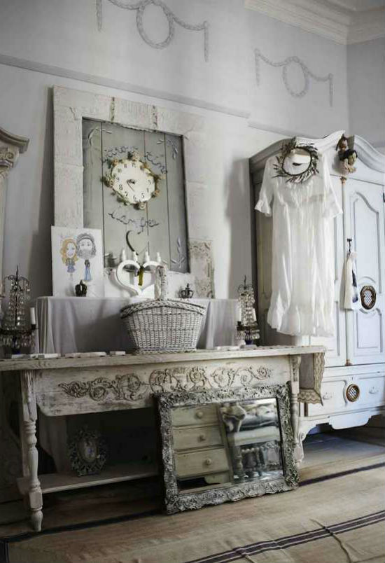 Хорошо смотрятся разные гирлянды и венки из ткани, органайзер для украшений или декоративные элементы из мешковины, различные искусственно состаренные баночки и флакончики, старые фотографии или рисунки на состаренной бумаге.