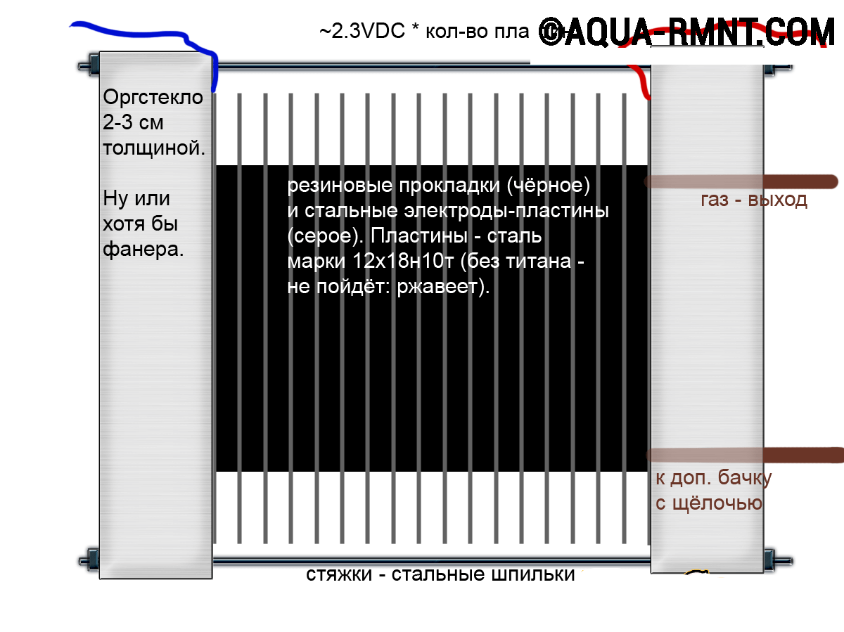 - Чтобы обеспечить принцип работы, выглядящий как прохождение электрического тока через пластины, погруженные в электролит для разложения жидкости на водород и кислород, нужно располагать одновременно двумя пластинами, одна из которых – анод, вторая – катод. В данном случае получается 8 шт. анодов и 8 шт. катодов.