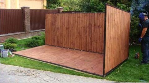 Следующий шаг – возведение стен. Используют целые квадратные доски и вагонку. Сначала их пропитывают олифой, крепят на шурупы к вертикальному каркасу. Устанавливают 3 глухих стены. Сверху крепят вагонку для защиты от ветра. В последнем этапе строение обязательно покрывают лаком.