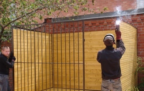 - Оставшуюся часть вольера перекрывают металлической рамой из горизонтальных и вертикальных прутьев. Крепится металлическая дверь с щеколдой. Лучше приварить пазы для навесного замка.
