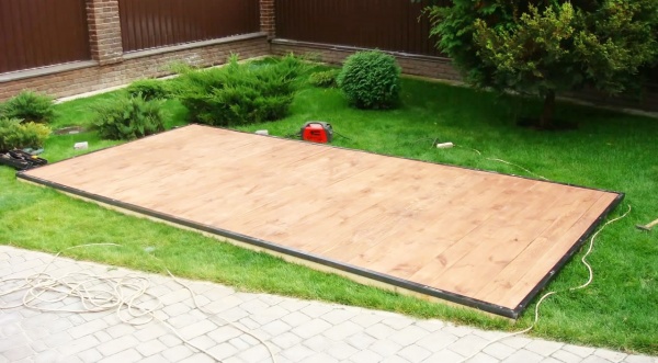 - Плоские доски (по 4-5 см в ширину) прибиваются по бокам готового пола (на длинной части прямоугольника – 3 доски, на короткой – 2), важно, чтобы бруски плотно состыковывались на углах;