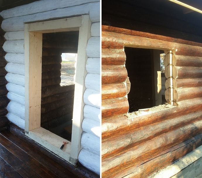 Косяки устанавливают в проёмы без жёсткого крепления к стенам сруба. При необходимости бревна сруба у края проёмов подтёсывают для того, чтобы их горбы не мешали установке наличников. Теперь можно устанавливать окна и двери. Они могут быть изготовлены из любого материала, который вам по душе.