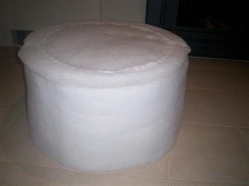 На верхнюю часть будущего пуфа приклеиваем поролон, а на боковую – синтепон. Теперь конструкция не только прочная, но и мягкая. Из ткани шьем чехол по параметрам получившейся конструкции. Для этого понадобится швейная машинка, или можете обратиться за помощью в ателье.