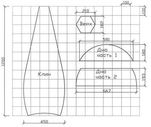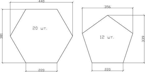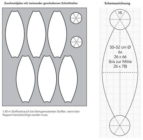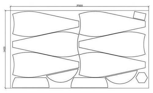 Верхний чехол пуфа состоит из шести клиньев, по форме напоминающие лепестки, и двух шестигранников – основания и верхней части. Длина клиньев может составлять 130 см, верхняя грань примерно 15 см, а нижняя 40 см. Шестигранники имеют соответствующую длину граней. Все детали сшиваются между собой.