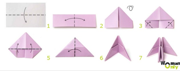 Итак, самый простой способ заключается в сворачивании листа в пять раз. Для этого вам нужно первые четыре раза лист сложить пополам, а пятый раз по диагонали. Этот метод очень простой, но минус его в том, что изделия получаются угловатые. Поэтому лучше поподробней рассмотрите другие способы сворачивания по ниже приведенным схемам.