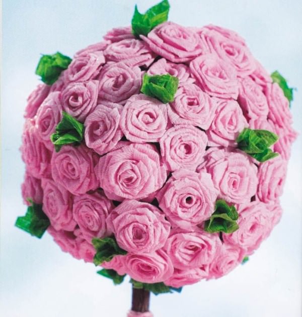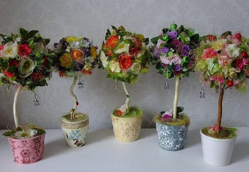 Выбор материалов для декорирования топиария огромен – вы можете использовать атласные ленты, фетр, органзу,флористическую сетку, шифон, сизаль, бумажные и искусственные цветы, гофрированную бумагу, салфетки. Применяются натуральные материалы, такие как желуди, шишки, консервированные цветы, сухие листья, зерна кофе и ракушки.