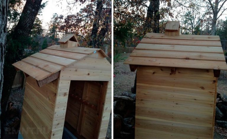 Дверь тоже делают своими руками. Из брусочков собирают каркас, обивают его доской и вагонкой, либо просто набивают доски и вагонку на два параллельных бруска, прикрепляют ручку и петли, навешивают на косяк. Все швы и стыки заделывают влагостойким герметиком, сверху коптильню покрывают мастикой и лаком. Последний штрих — просверливание отверстия для датчика температуры и его установка. На 50% коптильня из дерева готова.