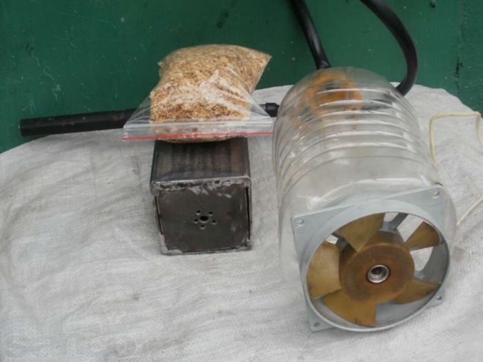 К штуцеру, идущему вниз, подсоединяется трубка от компрессора, к боковому — соединительный патрубок, ведущий к коптильному шкафу. В качестве вентилятора можно использовать компрессор от аквариума, кулер от компьютера или что-нибудь похожее — важно создать не слишком мощный, но постоянный поток воздуха, направленный к емкости, в которой происходит копчение.