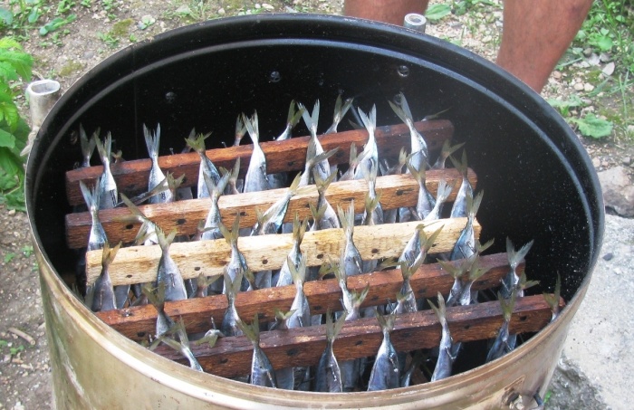 В нижнюю часть готовой конструкции засыпаются опилки или щепа. Когда дно коптильни нагреется до нужно температуры, щепа начнет постепенно дымить. Запустится процесс копчения, теперь нужно следить за температурой, количеством дыма и засечь время.
