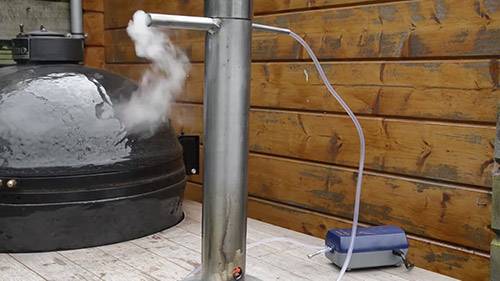Часто между дымогенератором и камерой коптильни устанавливают дополнительный узел – фильтр. Выполнен он отстойником из куска трубы. Проходящий по фильтру дым остывает, канцерогены в виде конденсата сливаются через вваренный на днище штуцер.
